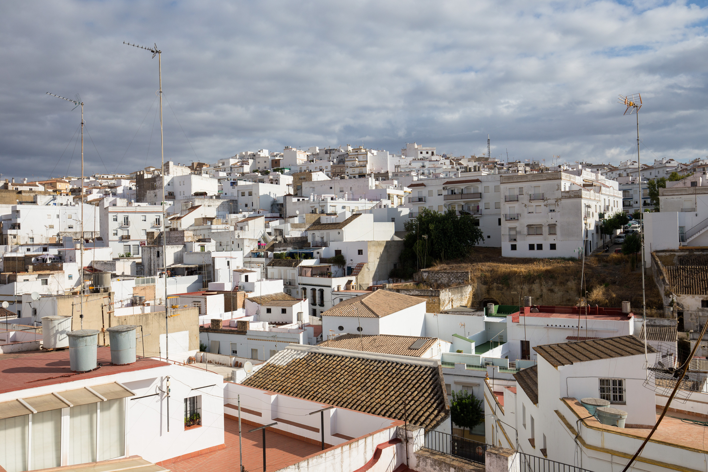 Beim Blick über die Häuserdächer von Arcos de la Frontera sieht man zahlreiche Terrassen, Antennen und Ziegelsteindächer. Die weißen Häuser werden von Sonnenstrahlen angeleuchtet.