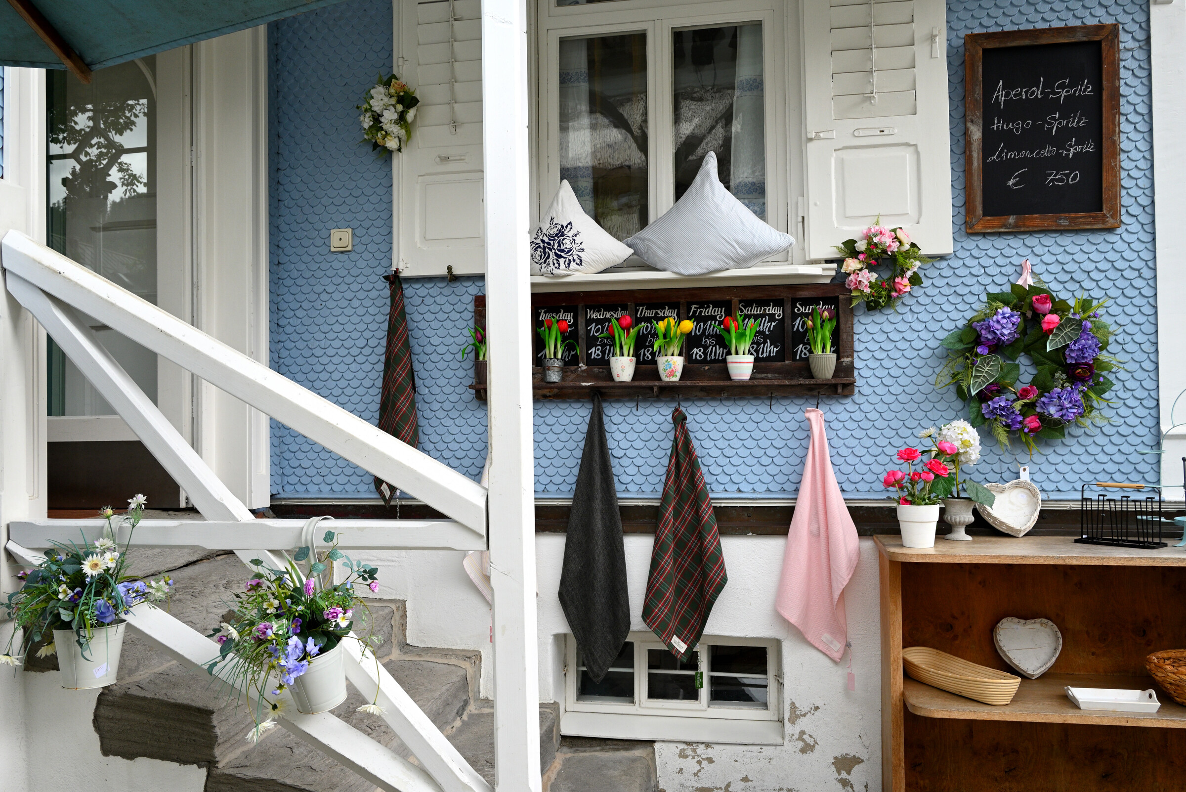 - weiße Wand mit blauer Holztür